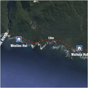 From the Waitutu Hut, the track is a marked route and is recommended for experienced trampers only. Westies Hut is located in a sea cave at Prices Harbour, signposted from the track about 2 km east of Big River.